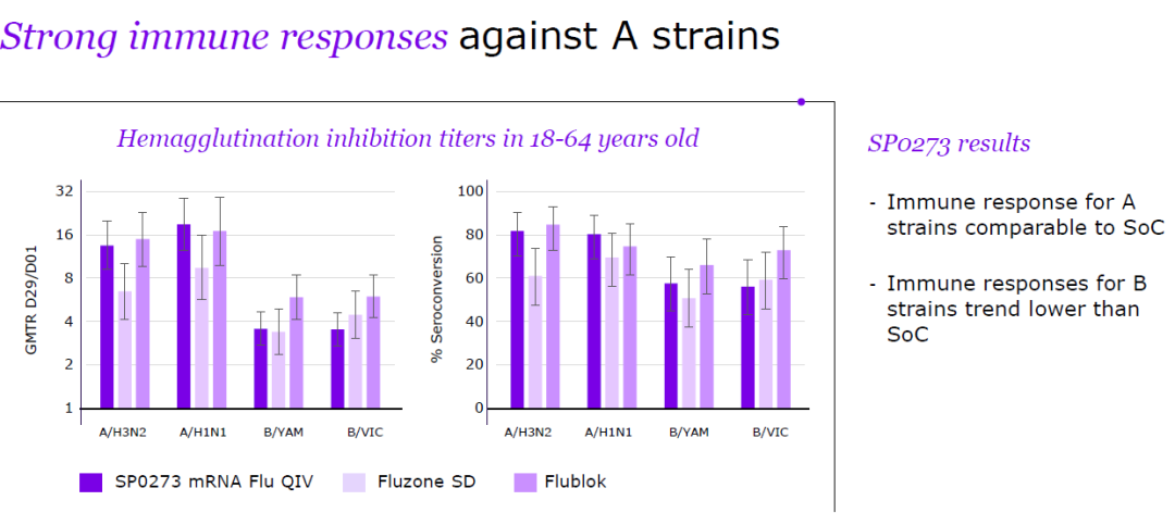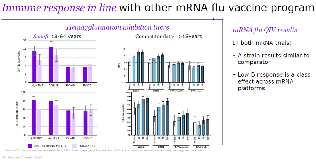 四价mRNA流感疫苗免疫原性数据如下,B型稍弱与Moderna类似,赛诺菲认为是mRNA技术平台的共性问题。