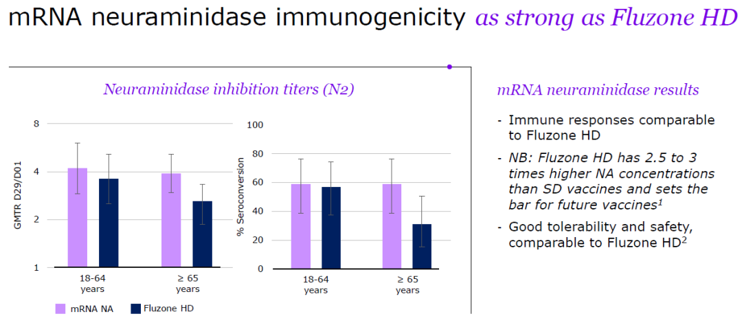 mNRA NA抗原疫苗免疫原性入局与Fluzone HD相当。