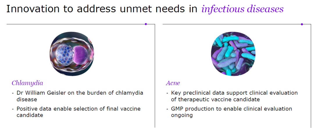 截至目前,仍有大部分病毒、微生物缺少有效疫苗,这方面赛诺菲重点攻坚衣原体疫苗和痤疮疫苗。