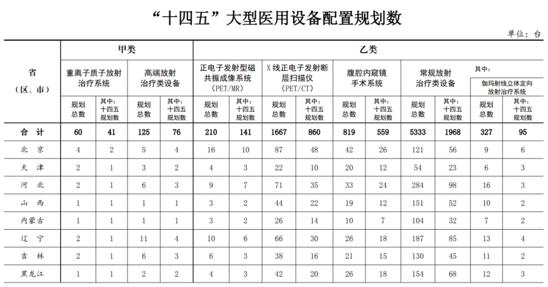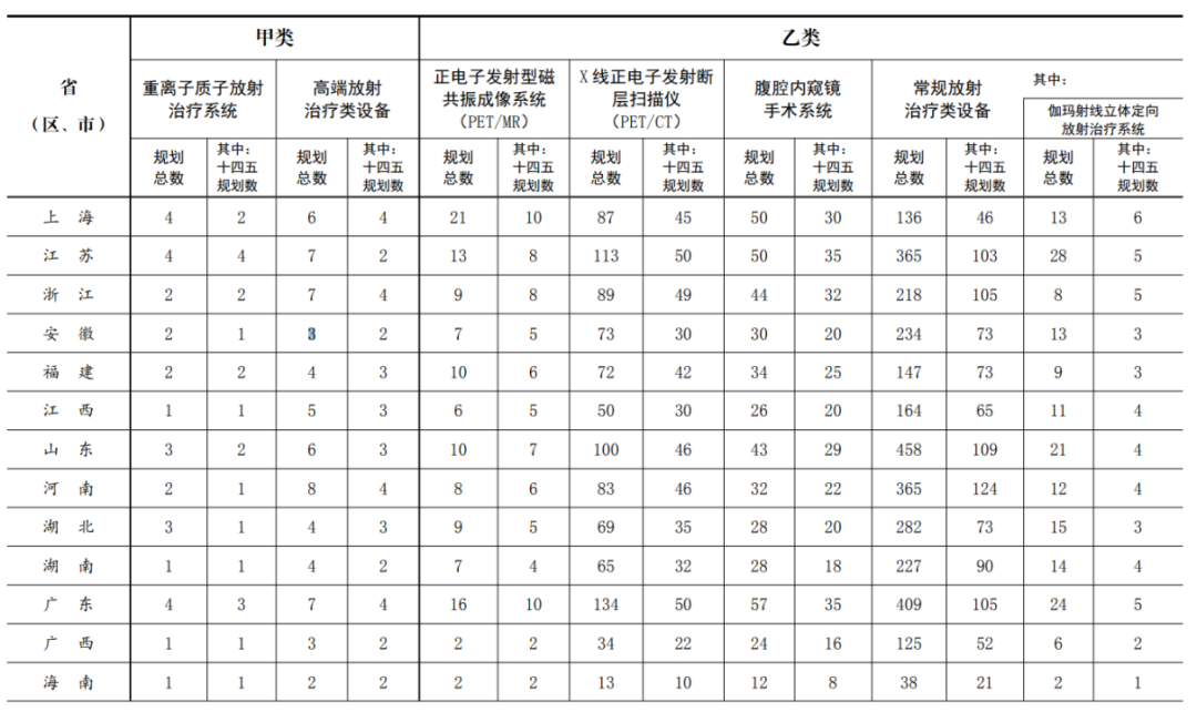 按照本次规划,“十四五”期间,全国规划配置大型医用设备3645台,其中甲类117台(重离子质子放射治疗系统41台、高端放射治疗类设备76台),乙类3528台(PET/MR 141台、PET/CT 860台、腹腔内窥镜手术系统 559台、常规放射治疗类设备1968台。(各地区规划数详见文末表格)