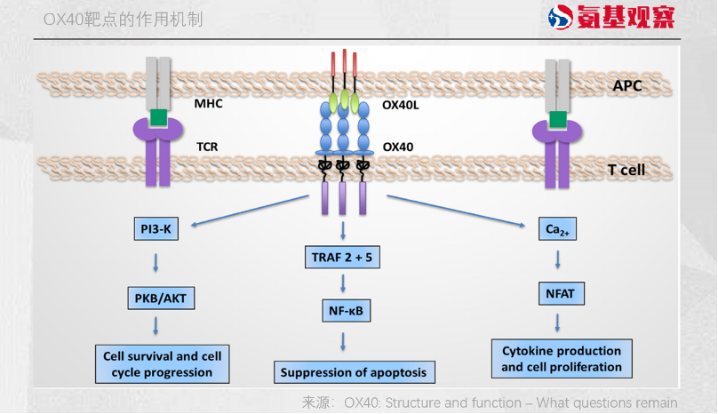 该靶点的具体作用是,APC细胞将抗原呈递给T细胞,使得其活化,随后T细胞表面的OX40与其配体OX40L结合,启动下游信号,延长活化T细胞存活时间。