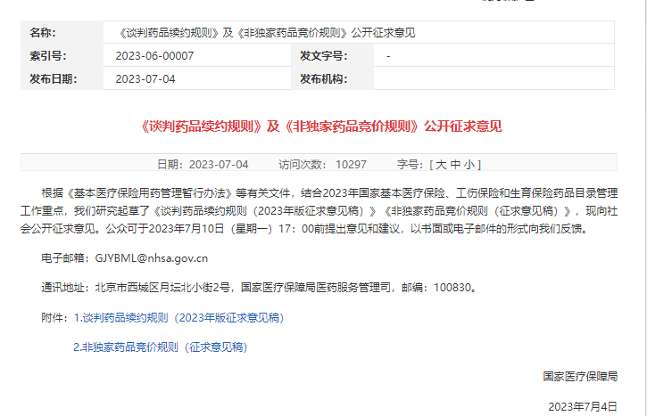 7月4日,国家医保局发布通告,结合2023年医保目录调整方案,对《谈判药品续约规则》及《非独家药品竞价规则》公开征求意见。公众可于2023年7月10日(星期一)17:00前以书面或电子邮件的形式提出意见和建议。