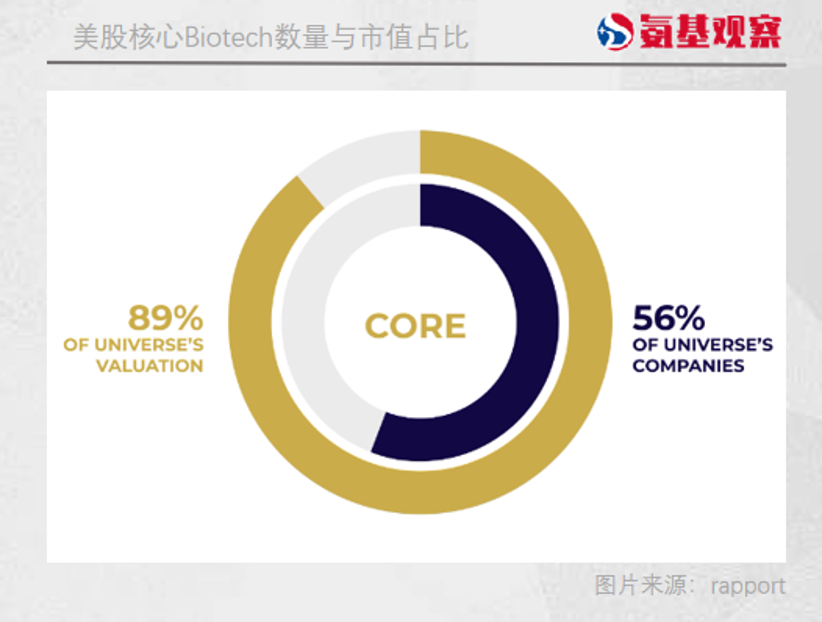 顾名思义,核心企业在整个生物科技行业的地位,相对于外围企业重要的多。这一点,也体现在两类企业的市值上,56%的核心企业占据了所有企业89%的市值。