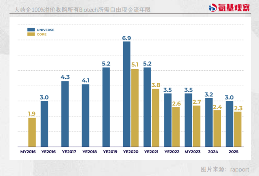 如今,Biotech的估值也显然已经低到符合Bigpharma心里预期。按照当下的情况来看,今年Big Pharma们只需要2.7年的自由现金流,就可以以100%的溢价收购美股所有的核心企业。