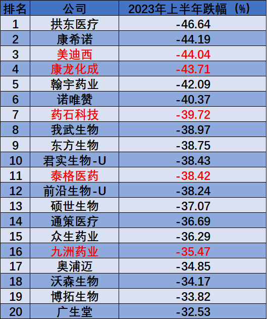 图:2023年A股医药公司跌幅榜,来源:锦缎研究院