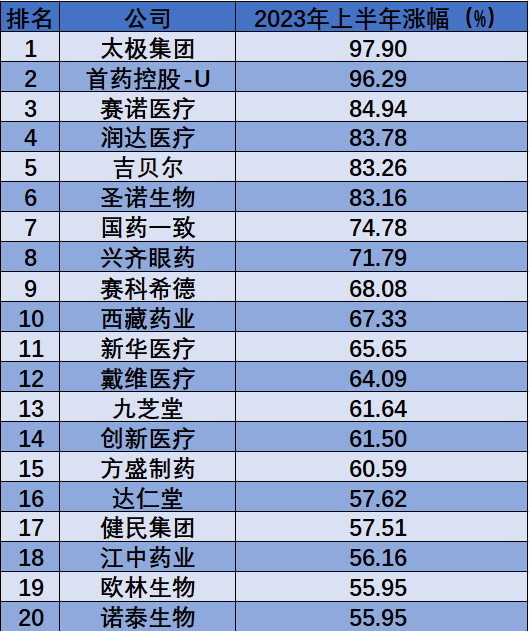图:2023年A股医药公司涨幅榜,来源:锦缎研究院