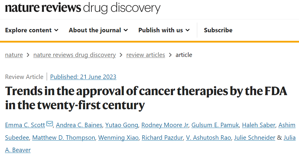 自上个世界末以来,癌症治疗领域发生了巨大变化,使癌症患者的治疗效果得到了实质性改善。近日,美国FDA药物评价与研究中心肿瘤疾病办公室的研究人员在 Nature 旗下综述期刊 Nature Reviews Drug Discovery 上发表了题为:Trends in the approval of cancer therapies by the FDA in the twenty-first century 的综述论文。