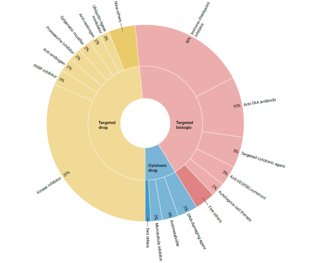 所有获批的产品可分为三组(细胞毒性药物、靶向药物、靶向生物制剂),根据作用机制进一步分为31类。