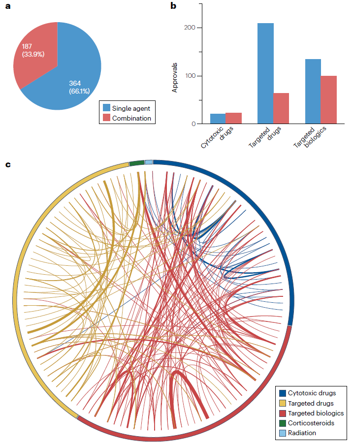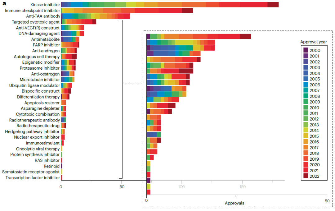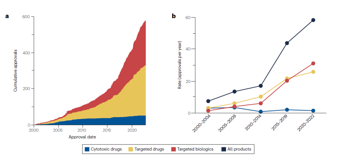 2000年1月1日至2022年10月31日期间,共有206种不同的肿瘤学产品获得了573项肿瘤适应症批准,其中50项为细胞毒性药物,277项为靶向药物,246项为靶向生物制剂。