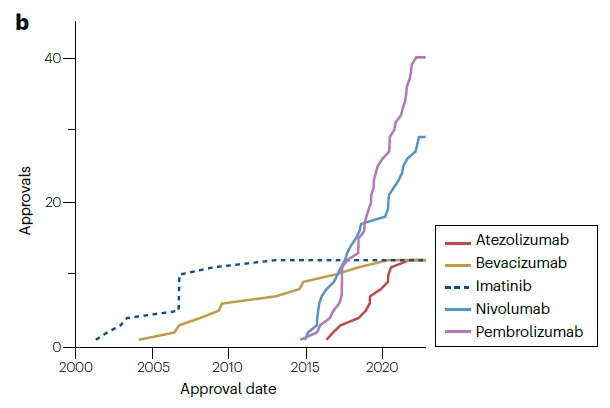 自2000年以来,有5种不同的产品分别获得了12个或更多的批准,其中3种是免疫检查点抑制(派姆单抗、纳武单抗和阿替利珠单抗),1种是血管内皮生长因子抑制剂(贝伐珠单抗),以及1种激酶抑制剂(伊马替尼)。