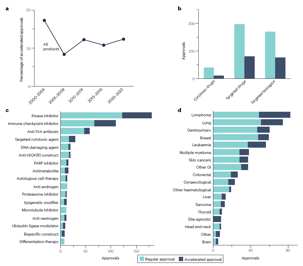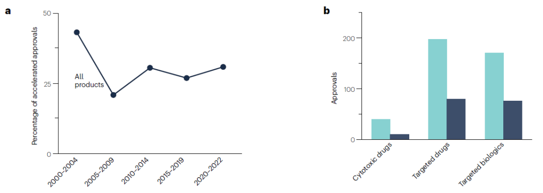 在整个分析期间,71%的批准(407/573)使用常规批准途径,29%(166/573)使用加速审批途径。近年来加速审批总数有所增加,但这反映了整个分析期间治疗产品批准率的总体增加,而不是加速审批在肿瘤学中使用的比例增加。在加速审批中,靶向生物制剂使用加速审批的比例最高(31%),靶向药物的试用比例略低(29%),细胞毒性药物的使用比例最低(20%)。
