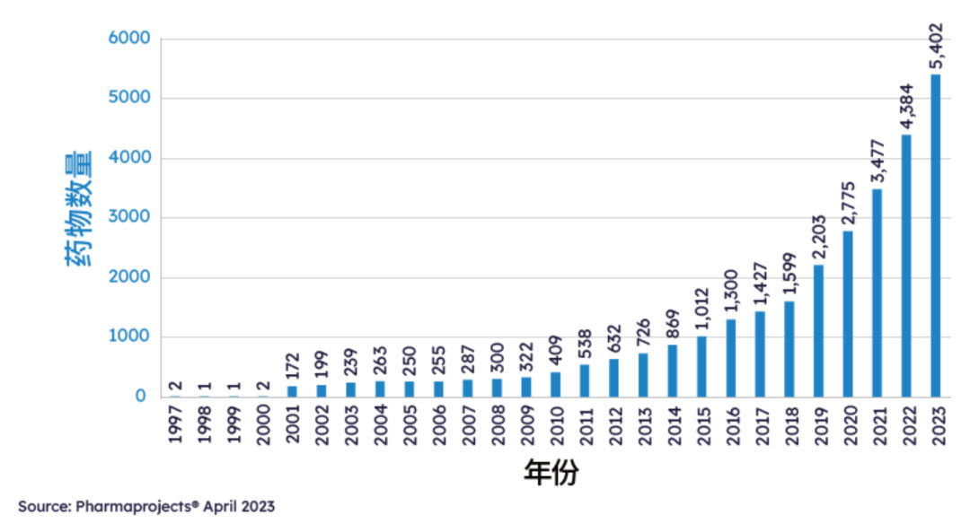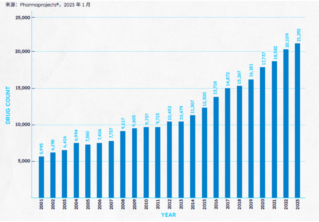 过去三年,新冠疫情影响下制药行业的动荡逐步平息,全球研发开始步入稳定增长的阶段。据Pharmaprojects® 2023年1月数据显示,2023年全球管线总规模再创新高,全球药品及疫苗数量共计21292个,较去年上涨5.9%。