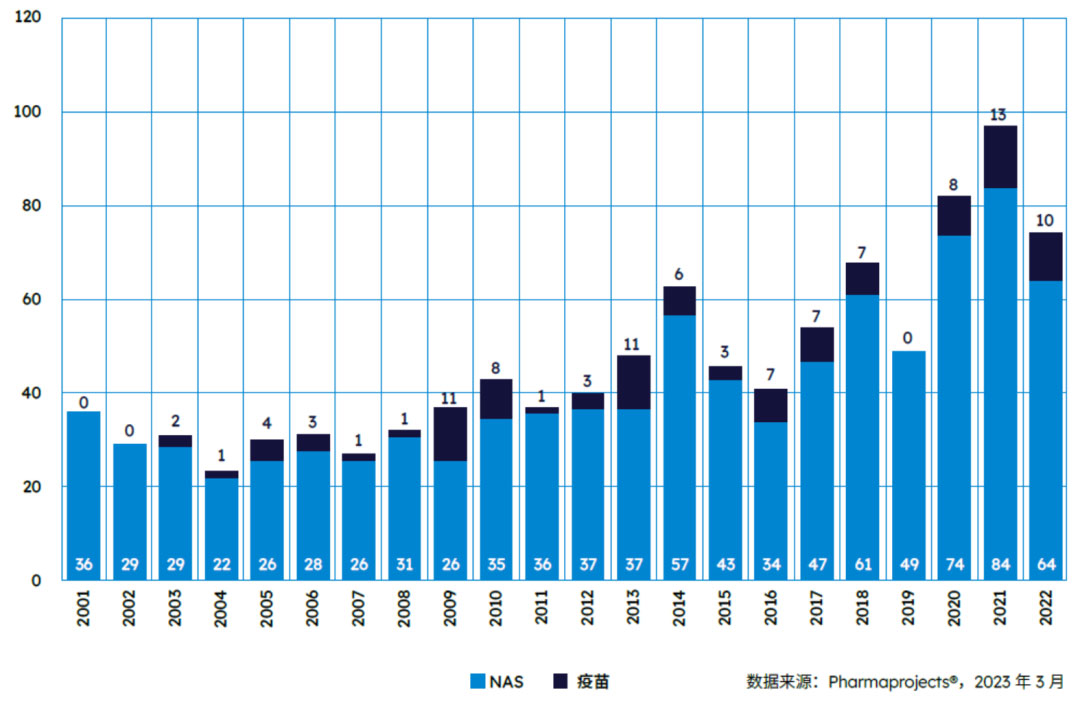 在《2023年医药研发年度回顾》的基础上推出的补充报告《2022年上市的新活性物质》, 就全球研发成果上市情况进行深入解读。纵览过往五年,全球推出的NAS(新活性物质,New Active Substance)数量一路上扬,彰显了全球医药创新的蓬勃生机。报告指出,2022 年全球共推出 73 款新药,其中包含 74 种新活性物质,是全球制药史上排名前三的年份。