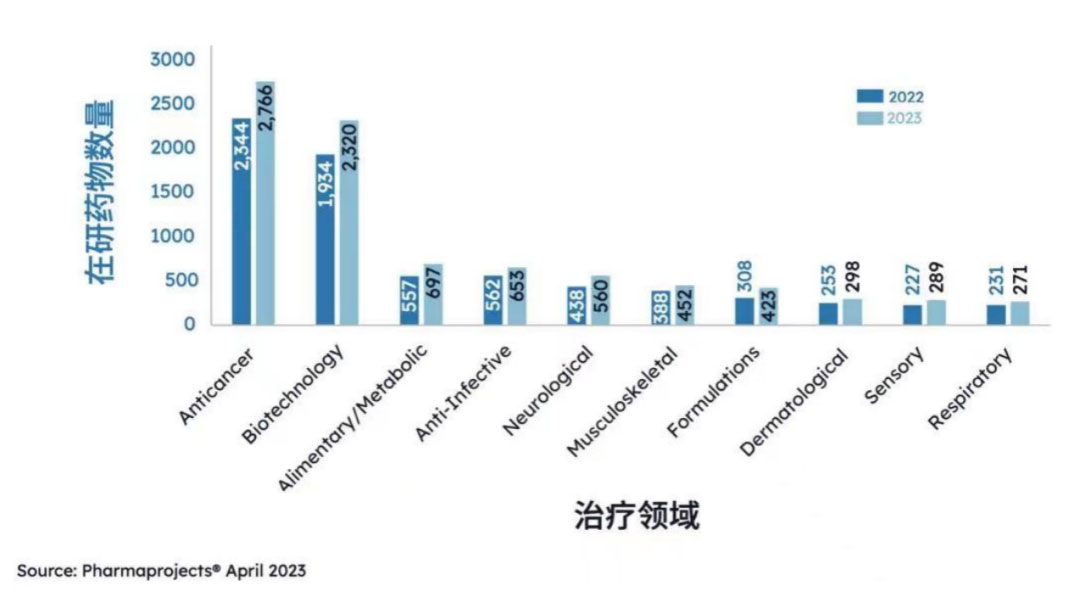 ▲2022和2023年按年份和治疗领域分列的中国管线