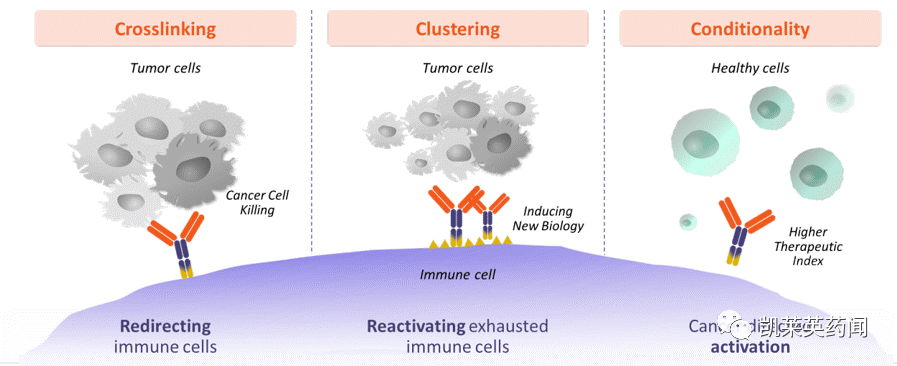 公司专有的平台是在天然抗体的Fc区创建两个不同抗原结合位点,称为 Fcab。产生的四价 (2+2) mAb2 双特异性抗体同时结合两种不同的抗原,通过crosslinking,clustering和conditionality三种方式实现安全、有效的免疫激活。Crosslinking:将两个不同的细胞或同一细胞上的两个受体结合在一起,以激活免疫系统。Clustering:受体聚集在细胞表面,以激活关键的免疫细胞途径。Conditionality:免疫细胞只有当受体同时被双抗结合时,才会被激活,旨在保证安全性。