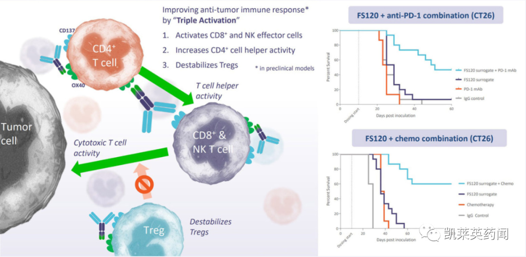 2、FS120:是同类首创的靶向OX40/CD137的双特异性抗体。临床前研究显示:细胞毒性CD8+和CD4+ T辅助细胞的双重激活和Tregs的重编程,导致抗肿瘤免疫反应;条件活性和Fcγ受体(Fcγ r)为零,提高了药物的安全性。目前正在进行的I期单药试验,以支持未来与KEYTRUDA的联用治疗研究。