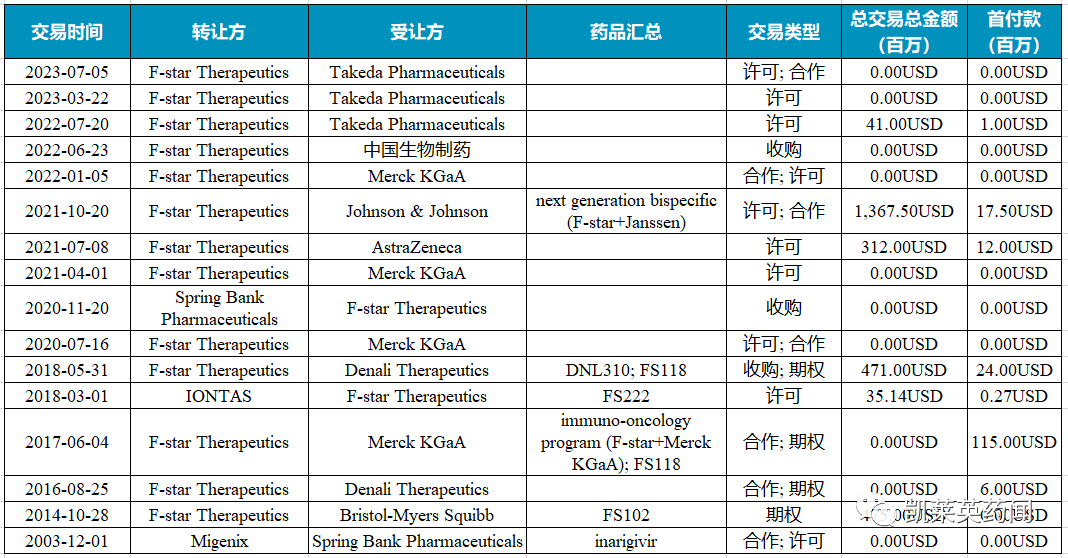 2022年7月,F-star首次与武田签订许可协议。根据协议条款,F-star将授予武田使用 F-star 专有的 Fcab 和mAb 2 平台,针对免疫肿瘤靶点的双特异性抗体进行研究、开发和商业化的全球独家特许权使用许可。武田将负责协议项下的所有研究、开发和商业化活动。F-star 将获得 100 万美元的预付款;倘若实现所有里程碑,F-star 将有资格获得高达约 4000 万美元的开发和商业化里程碑付款,以及年净销售额的特许权使用费。