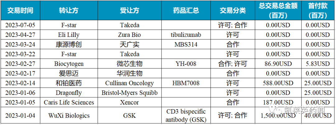 据不完全统计,2023年上半年,针对双抗及多抗产生的交易共9笔,披露首付款共计9583万美元,交易总额高达23.62亿美元。其中国外转国外5笔,国内转国内3笔,国内转国外1笔。