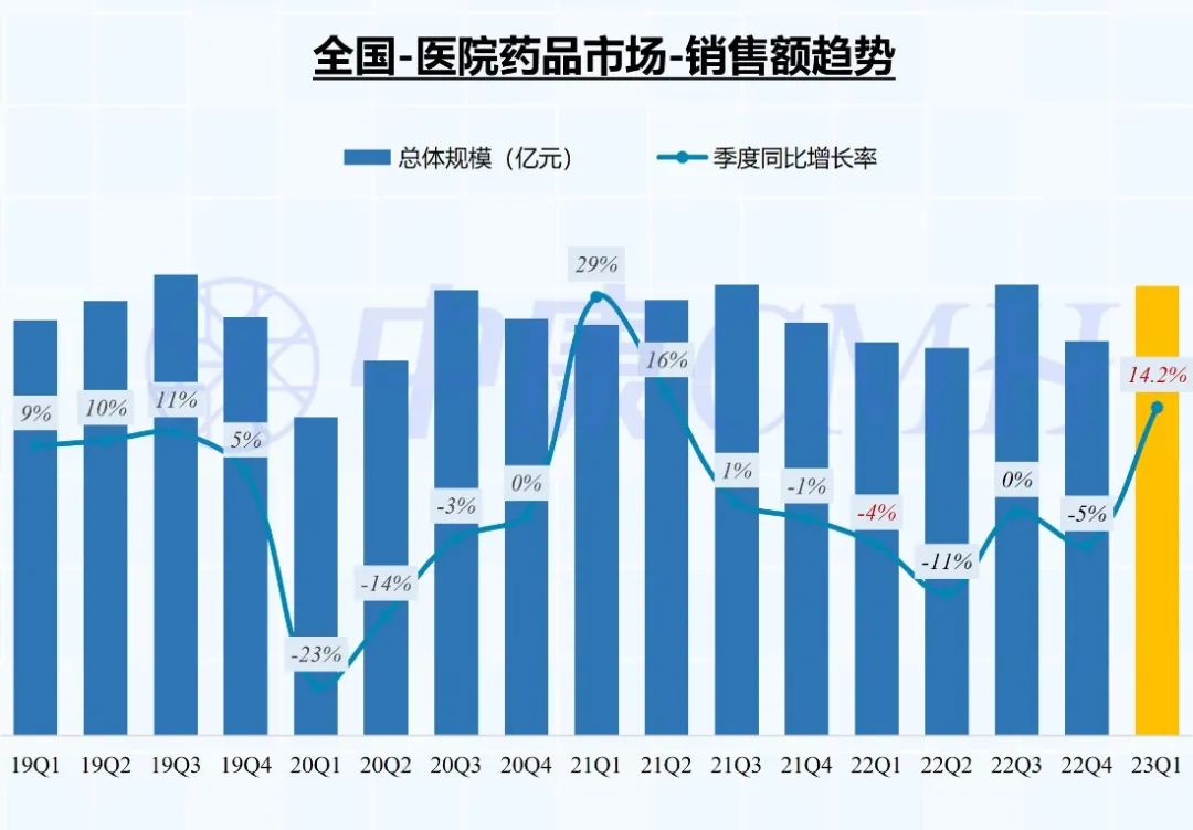 2022年中国二级及以上公立医院药品市场销售额总数达9,395亿元,同比2021年下跌4.9%。2023年第一季度,医院药品销售总额环比快速提升,销售额达2,594亿元。与2022年第一季度相比,本季度销售额同比双位数增长(+14.2%)。