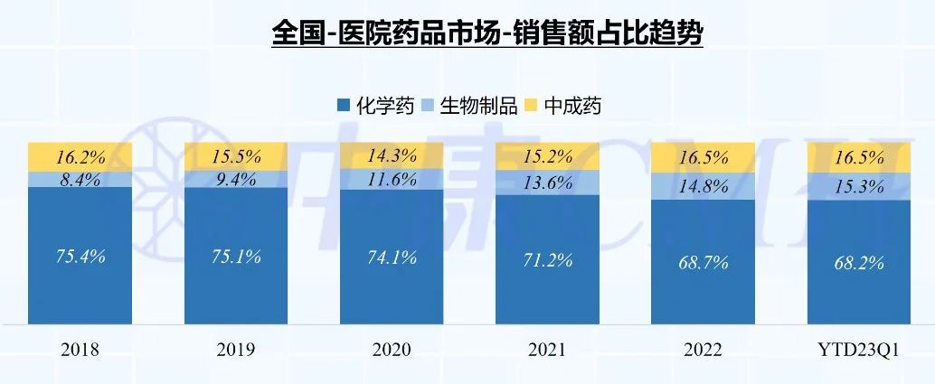 自2019年集采制度执行以来,化学药在医院市场的销售份额占比逐年下滑,由2018年的75.4%下滑至2023Q1的68.2%。生物制品销售份额不断提升,2023Q1份额占比为15.3%,中成药占比16.5%。