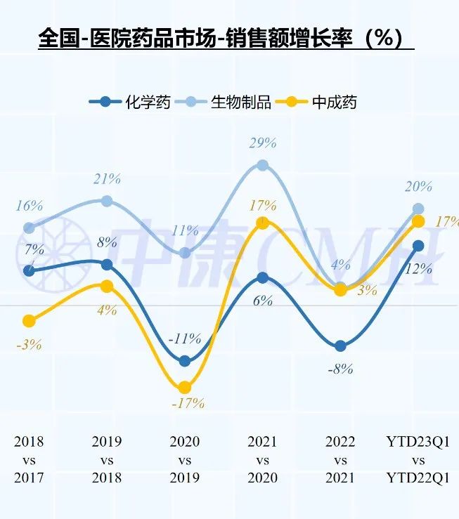 2023年第一季度,化学药、生物制品和中成药销售额均获得亮眼增长,同比增速分别为12%、20%、17%。