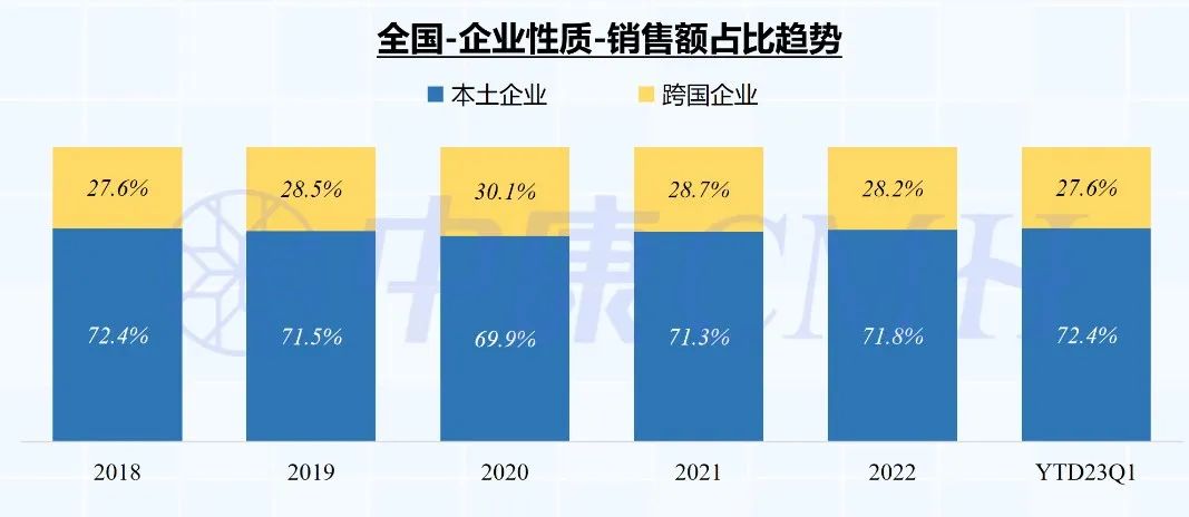 份额占比提升至72.4%从不同企业性质来看,2023Q1本土企业销售额占比已达72.4%,回升至2018年水平,跨国企业份额占比27.6%。