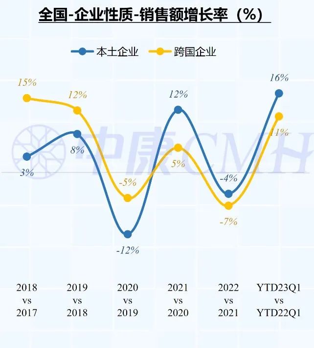 与去年第一季度相比,本土企业和跨国企业2023年第一季度销售额同比均有所回升,增速提高到双位数水平,其中本土企业增长更为领先,为16%;跨国企业增长11%。