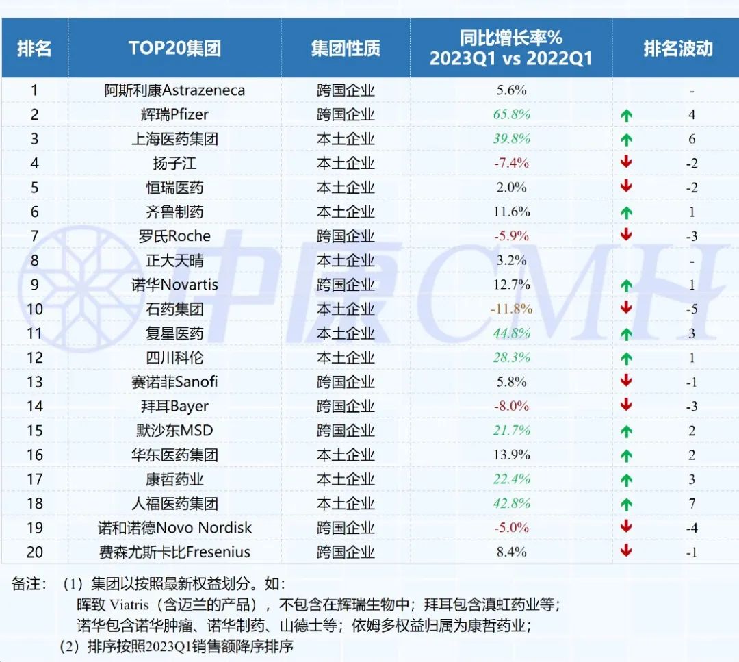 聚焦TOP20集团表现,阿斯利康、辉瑞、上海医药集团医院市场规模位居前三,其中辉瑞、上海医药集团在抗感染药物的增长驱动下,销售规模快速提升,同比增速分别达65.8%、39.8%。复星医药、四川科伦、默沙东、康哲药业和人福医药集团增长表现亦十分亮眼,增速超20%。