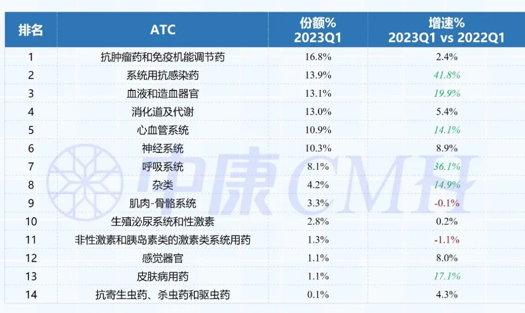 辉瑞新冠药规模暴涨543倍从ATC分类来看,2023Q1销售额排名前三的治疗领域为抗肿瘤药和免疫机能调节药、系统用抗感染药、血液和造血器官用药,销售额同比增速分别为2.4%、41.8%、19.9%。14个治疗领域用药中,除系统用抗感染药、血液和造血器官用药外,心血管系统、呼吸系统、皮肤病用药也获得双位数增长。