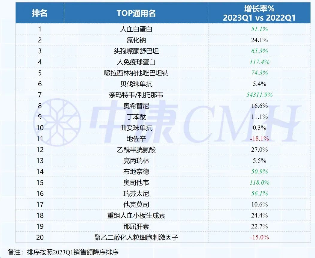 排名前20名的通用名中,5个为系统用抗感染药物,分别为头孢哌酮舒巴坦、人免疫球蛋白、哌拉西林钠他唑巴坦钠、奈玛特韦/利托那韦和奥司他韦,2023Q1销售额同比增速均超50%,其中辉瑞的奈玛特韦/利托那韦规模暴涨543倍。人血白蛋白(血液和造血器官用药)、布地奈德(呼吸系统用药)、瑞芬太尼(神经系统用药)销售规模亦获得快速提升。