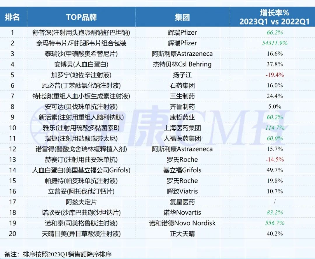 从产品维度来看, TOP20品牌中,除加罗宁和赫赛汀两个产品2023Q1规模下滑外,其他各品牌医院销售额均提升,其中辉瑞的抗感染药物舒普深上涨66%,奈玛特韦片/利托那韦片暴涨543倍,规模位居市场前两名。此外,新活素、雅乐、瑞捷、诺欣妥、诺和泰品牌规模增长表现优异,同比增速超50%。