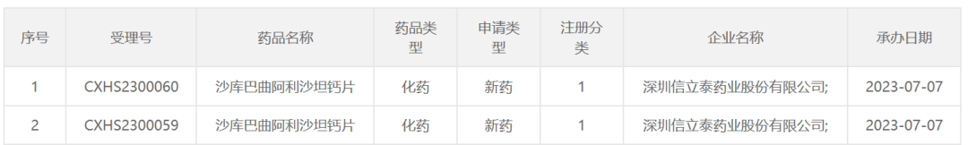 7月7日,中国国家药品监督管理局药品审评中心(CDE)官网最新公示,信立泰1类新药沙库巴曲阿利沙坦钙片递交了上市申请并获得受理。公开资料显示,这是信立泰研发的一款血管紧张素II受体-脑啡肽酶双重抑制剂S086,目标适应症为高血压和慢性心力衰竭。信立泰曾在新闻稿中表示,该产品上市后将进一步丰富公司心血管领域创新产品管线。