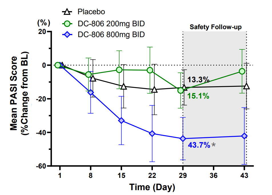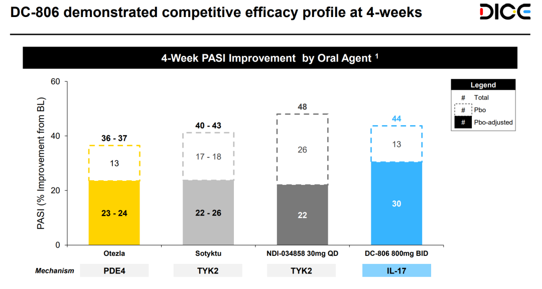 早些年上市的口服PDE4抑制剂阿普斯特,治疗16周后患者的PASI-75应答率为40%,32周为53%,而DC-806高剂量组治疗4周时就达到了43.7%的PASI-75应答率,却在后续的治疗中有尾部上扬的趋势。