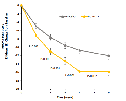 该药物是60多年来首款具有新作用机制的治疗抑郁症的口服药物,为NMDA受体拮抗剂,主要成分是右美沙芬以及安非他酮。该药物起效迅速,由下图可以看出,服用该药1周即可显著改善抑郁症状况,6周时相较于安慰剂,MADRS量表(蒙哥马利抑郁评定量表)评分获得显著改善。