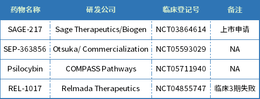 登录clinicaltrials.gov网站搜索“MDD”,共出现2589项相关的临床试验,但目前处于临床3期及以上阶段的新药依旧较少,下表是笔者查询到的几款药物,其中REL-1017已于2022年宣布临床3期试验失败。