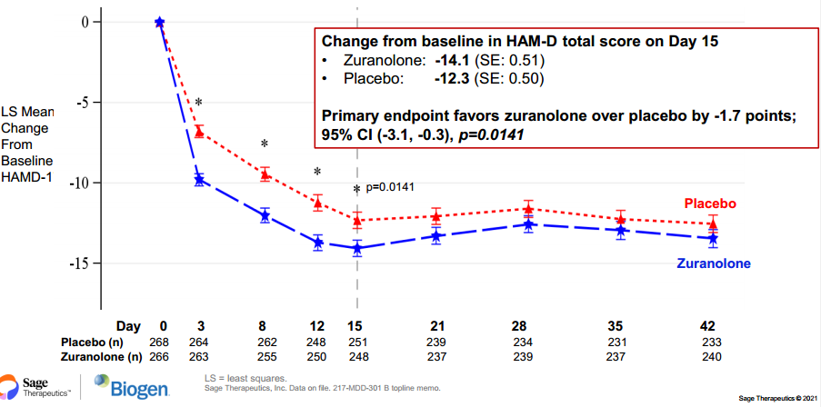 据217-MDD-301B试验数据显示,SAGE-217在第15天时,HAMD-17(17项汉密尔顿抑郁量表)评分相比于安慰剂具有统计差异,可减轻患者临床症状。
