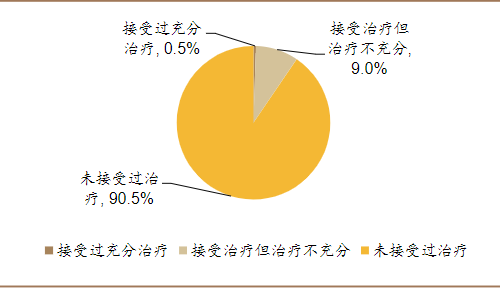 北京大学第六医院黄悦勤教授领衔的《中国抑郁障碍患病率及卫生服务利用的流行病学现况研究》对28140名抑郁症患者进行调查,结果显示其中9.5%接受过相关治疗,而此外的90.5%的抑郁症患者未接受过相关的治疗。