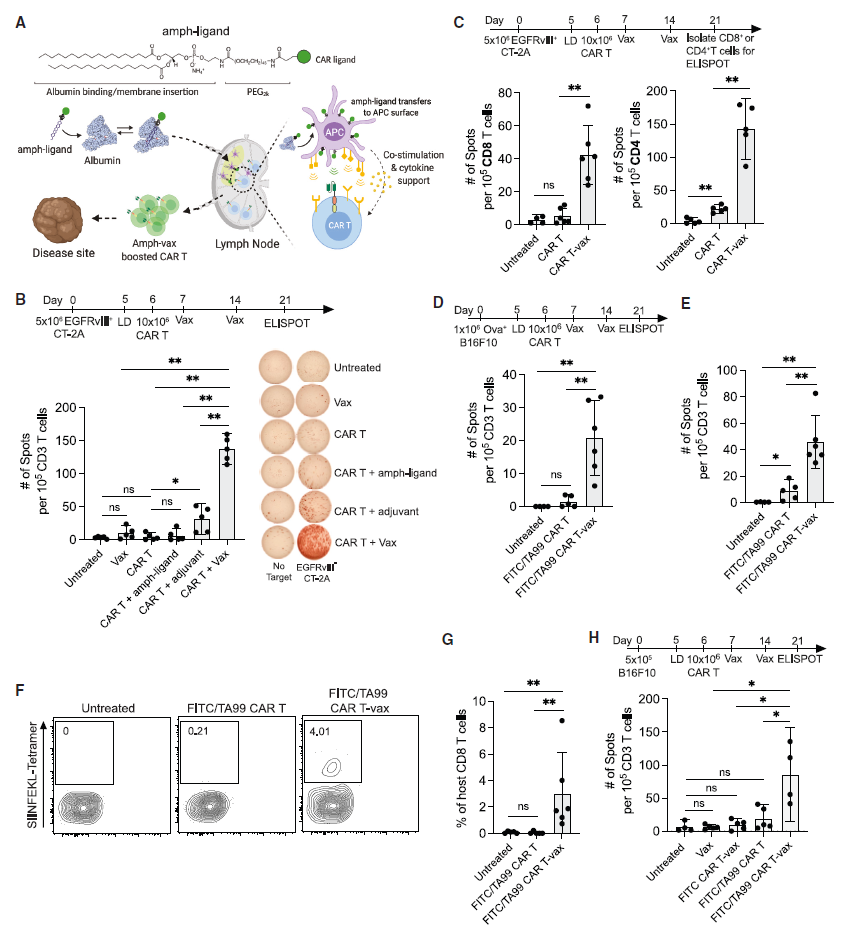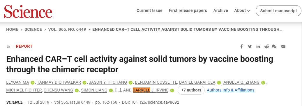 在2019年发表于Science上的一项研究中,Irvine教授和他的同事们在给小鼠注射工程化T细胞后不久,通过给小鼠注射疫苗,增强了CAR-T细胞对抗胶质母细胞瘤的有效性。这种疫苗携带CAR-T细胞靶向的相同抗原,被淋巴结中的免疫细胞吸收。