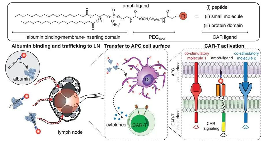 设计一种增强 CAR-T的两亲性配体疫苗:化学结构示意图(上)、作用机制(下)(来源:Science)