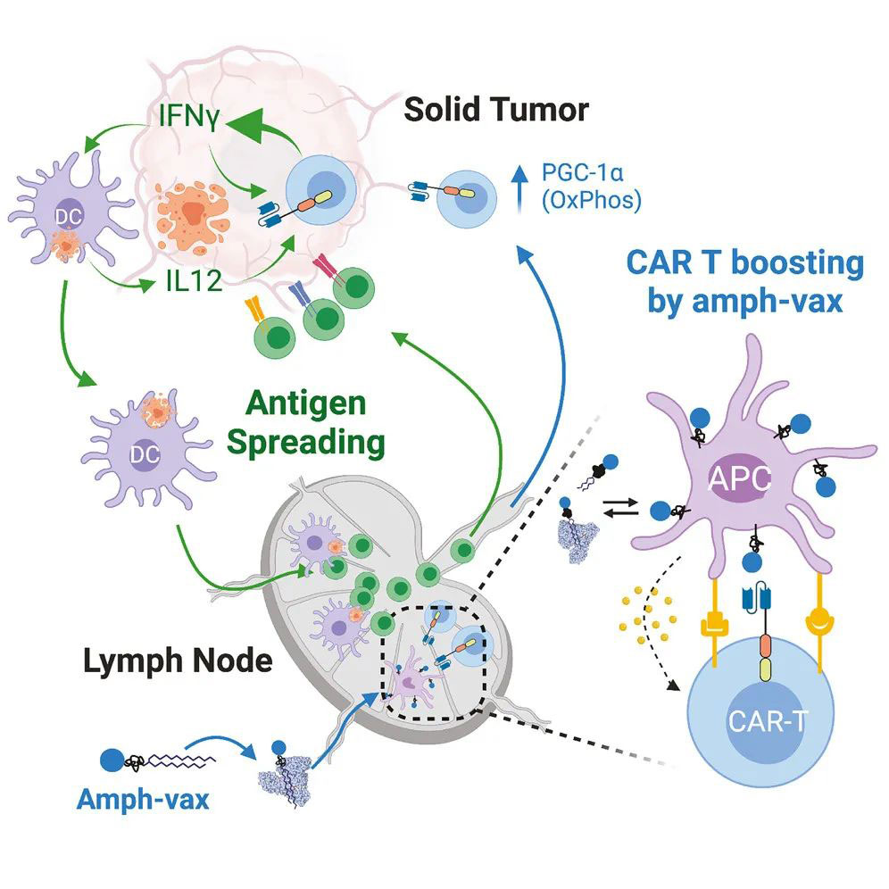 在那项研究中,科学家们发现,这种疫苗增强剂不仅有助于工程化的CAR-T细胞攻击肿瘤,而且还有另一种意想不到的效果:它有助于产生靶向其他肿瘤抗原的宿主T细胞。