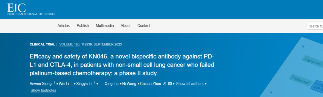 2023年7月10日,中国苏州——康宁杰瑞生物制药(股票代码:9966.HK)宣布,PD-L1/CTLA-4双抗KN046单药治疗晚期非小细胞肺癌的Ⅱ期临床研究结果,在线发表于国际肿瘤领域知名期刊European Journal of Cancer(EJC,最新SCI影响因子8.4001)。上海市肺科医院周彩存教授为该文通讯作者。