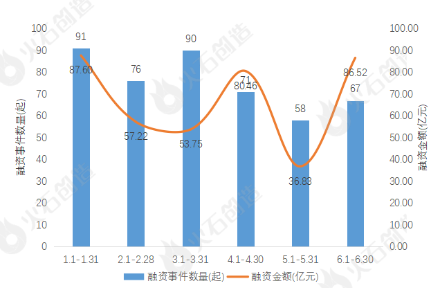 图 5:上半年各领域融资数量及金额分布情况 来源:火石创造产业数据中心