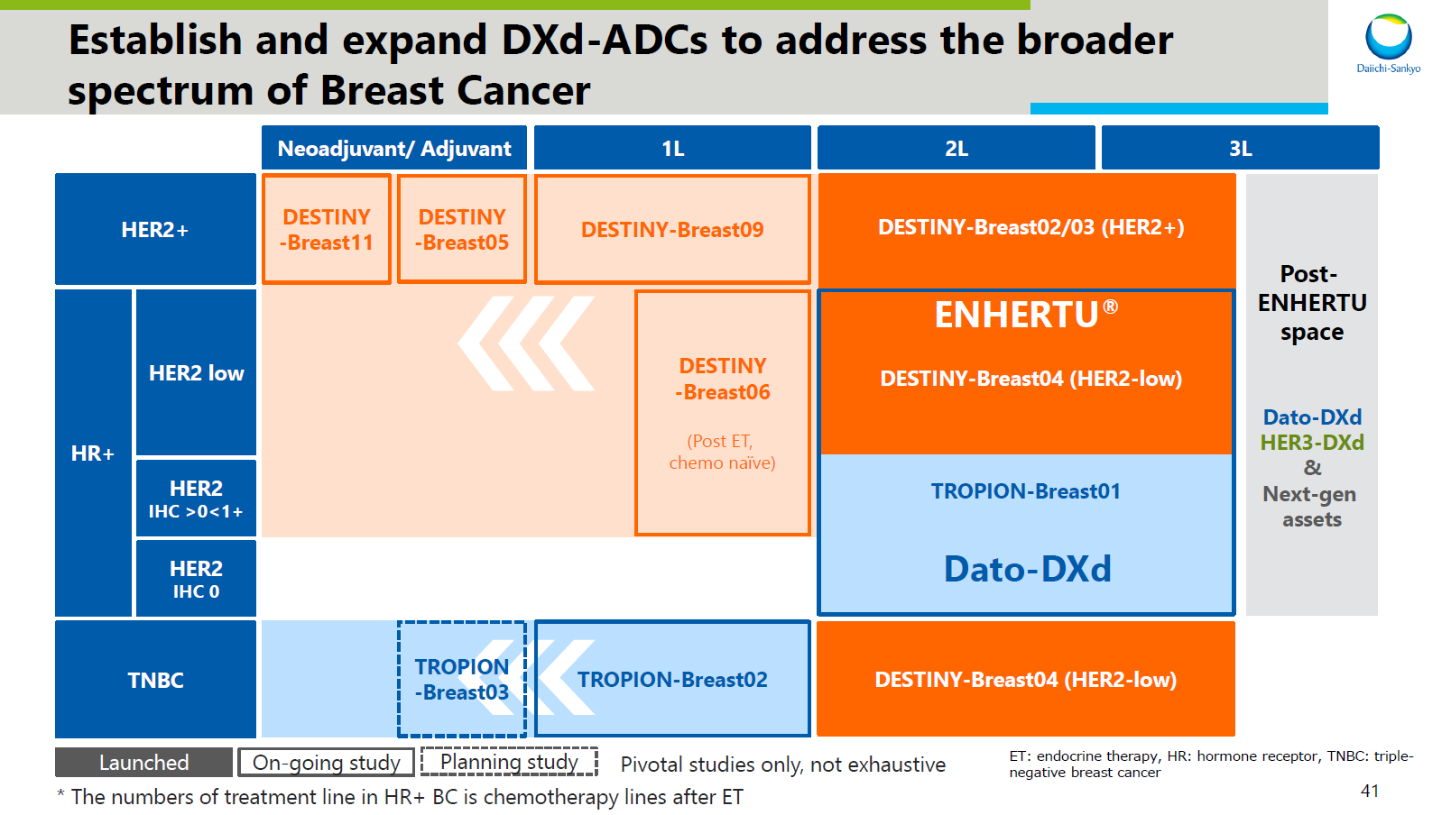 去年,他们凭借 HER2 低表达乳腺癌的突破性研究 DESTINY-Breast04(简称 DB04),引领了乳腺癌诊疗标准的革新,点燃这一赛道;随后又拿下首个 NSCLC 监管批准,势头正盛。在中国,Enhertu 也已经迅速上市商业化,HER2 低表达乳腺癌适应症正在审评中,大概率年内获批。