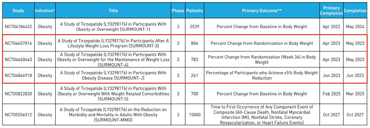 Tirzepatide:肥胖适应症 6 项 III 期结果逐渐释放