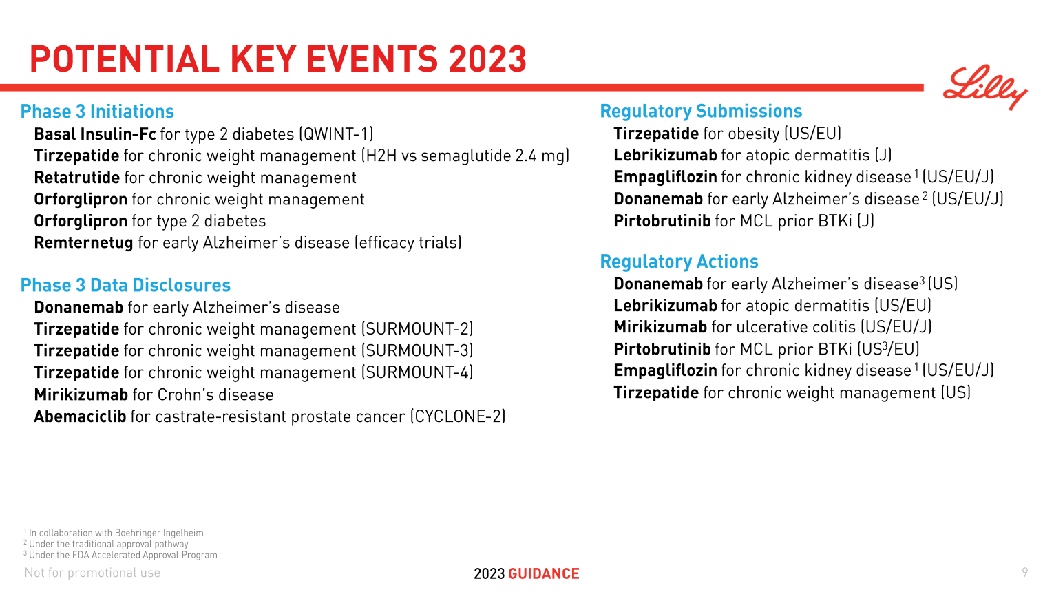 其中,SURMOUNT-1 和 SURMOUNT-2 临床数据已经读出,SURMOUNT-3、SURMOUNT-4 和 SURMOUNT-J 临床试验完成时间分别在 2023 年 5 月、5月、6 月,意味着这 3 项重要结果有望出炉;同时,礼来公布的预期关键里程碑中,也包括了这些临床试验。
