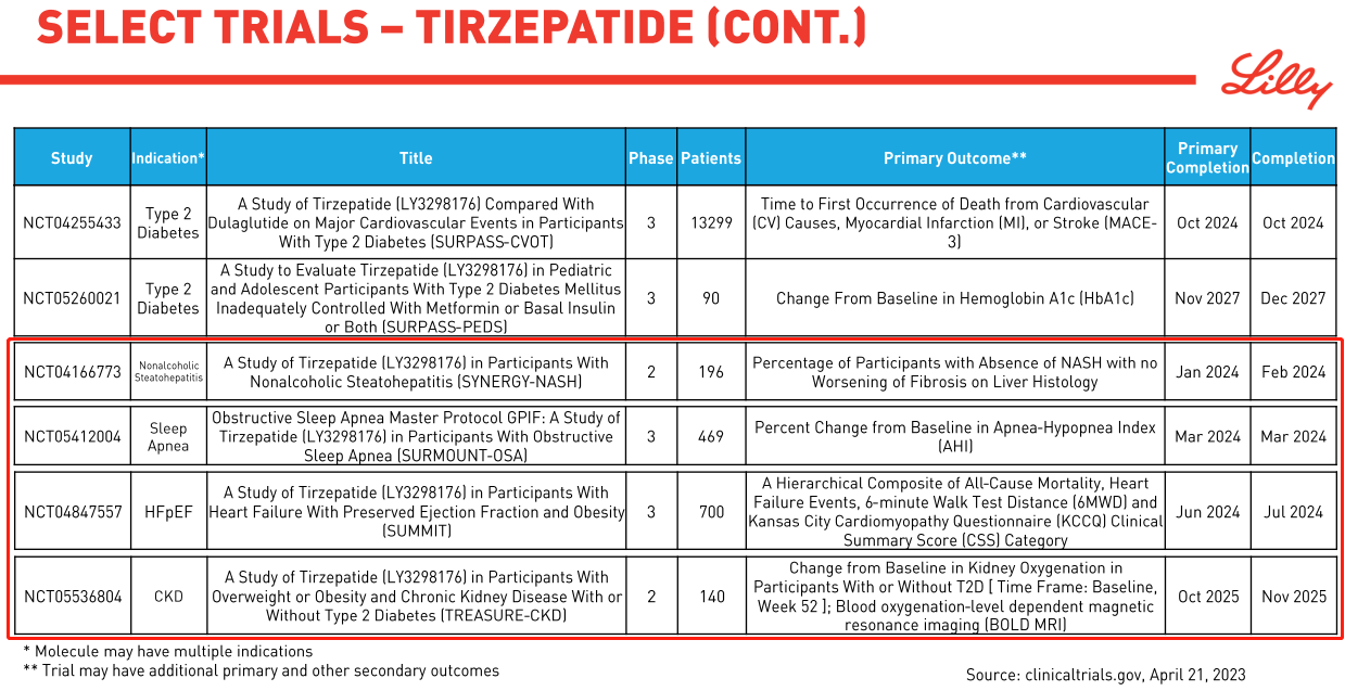 不仅如此,Tirzepatide 在非酒精性脂肪肝(NASH)、睡眠呼吸阻塞(OSA)、慢性肾病(CKD)和心力衰竭上也有布局。前两项适应症临床试验有望在 24 年初结束,24 年中至 25 年后两项适应症临床试验也将陆续读出结果。