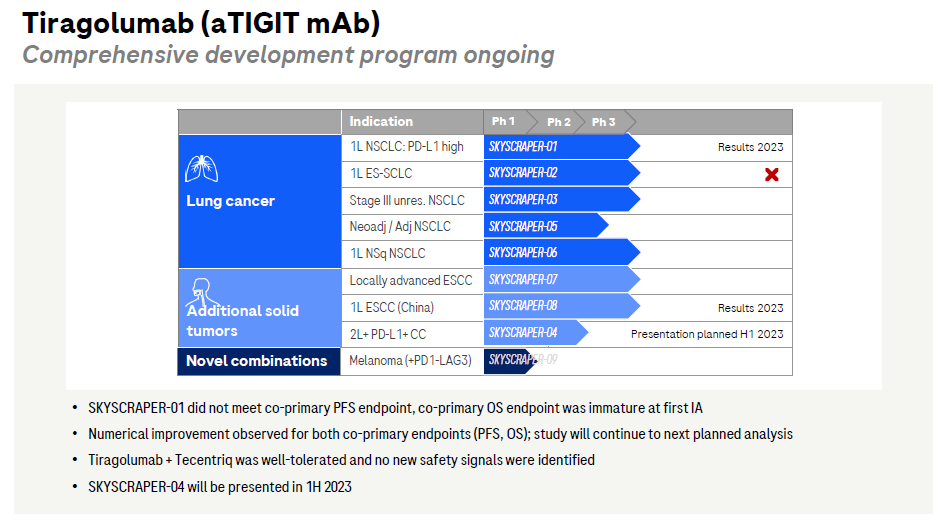 SKYSCRAPER-01 是针对初治 PD-L1 高表达局部晚期、不可切除或转移性 NSCLC 的随机、双盲、全球多中心 III 期临床,考察 Tiragolumab 联用 PD-L1 单抗阿替利珠单抗(Tecentriq®)的疗效和安全性。据罗氏临床里程碑披露,2023 年度或将公布 SKYSCRAPER-01 试验结果,届时 OS 结果有望出炉。罗氏表示,在中期分析中就已经观察到了共同主要重点 PFS 和 OS 在数值上的改善。
