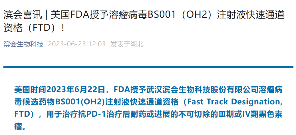 6月23日,滨会生物发布新闻稿称,美国FDA授予其溶瘤病毒候选药物BS001(OH2)注射液快速通道资格,用于治疗抗PD-1单抗治疗后耐药或进展的不可切除的Ⅲ期或IV期黑色素瘤。