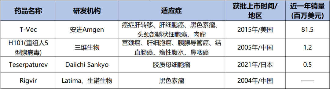 全球范围内已获批的四种溶瘤病毒的原研机构分别为安进、东京大学、Sia Latima以及上海三维生物科技有限公司。2005年,我国批准了第一个溶瘤腺病毒药物——H101(重组人5型腺病毒)联合化疗用于治疗晚期鼻咽癌患者。