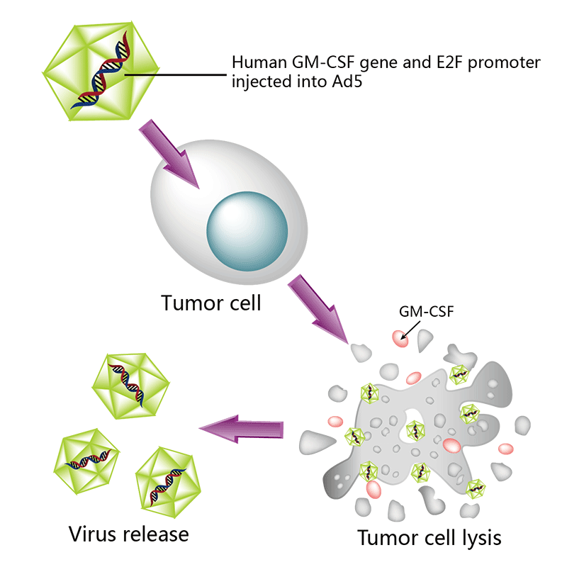 CG0070是一种基因修饰的5型腺病毒(Ad5),被修饰后包含癌症选择性启动子E2F-1和免疫细胞刺激因子GM-CSF基因,选择性地在Rb调控缺陷的肿瘤细胞内复制并裂解肿瘤细胞。癌细胞的破裂会释放出肿瘤源性抗原和随病毒一起表达的GM-CSF,从而刺激全身性抗肿瘤免疫反应。